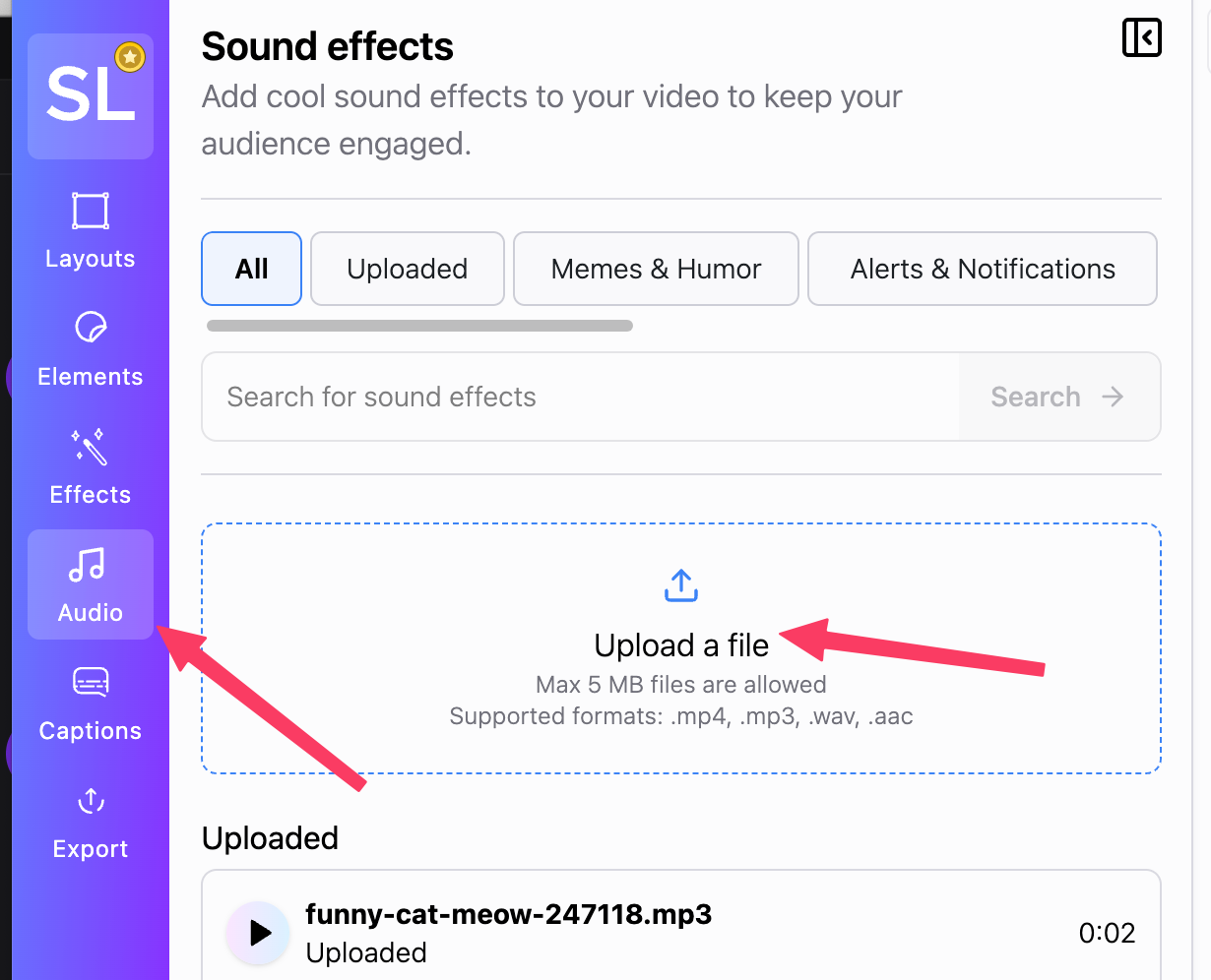 To upload custom audio to StreamLadder, to be used in a video, select the “Audio” tab in the Clip Editor.